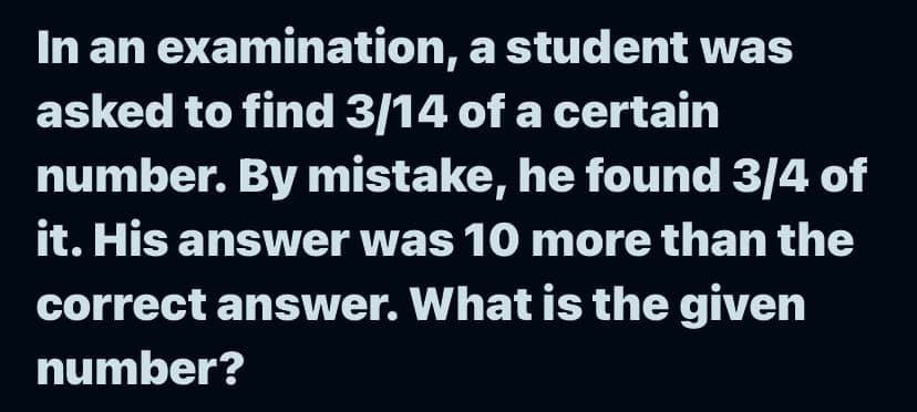 In an examination, a student was asked to find 3/14 of a certain number. By mistake, he found 3/4 of it. His answer was 10 more than the correct answer. What is the given number?